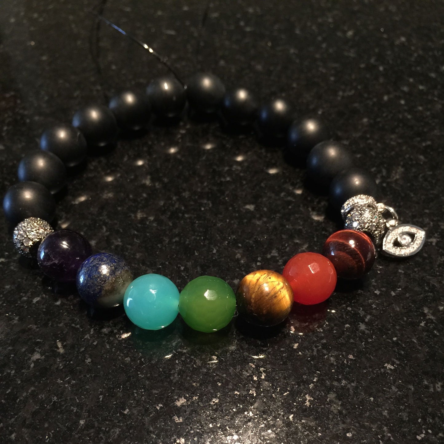The chakra is flanked on each side with micropave Cubic Zirconia beads and Cubic Zirconia evil eye charm to the right of the Root Chakra. The black beads are matte Black Onyx.