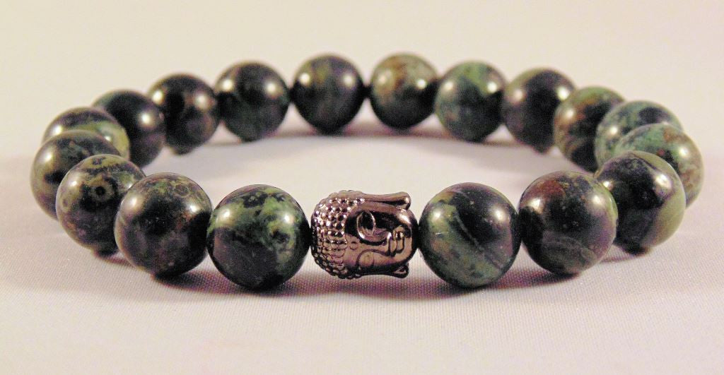 This handmade stretch bracelet is unisex and made with 10 mm Kambaba Jasper beads and gunmetal tone pewter Buddha head focal bead. One size fits most.
